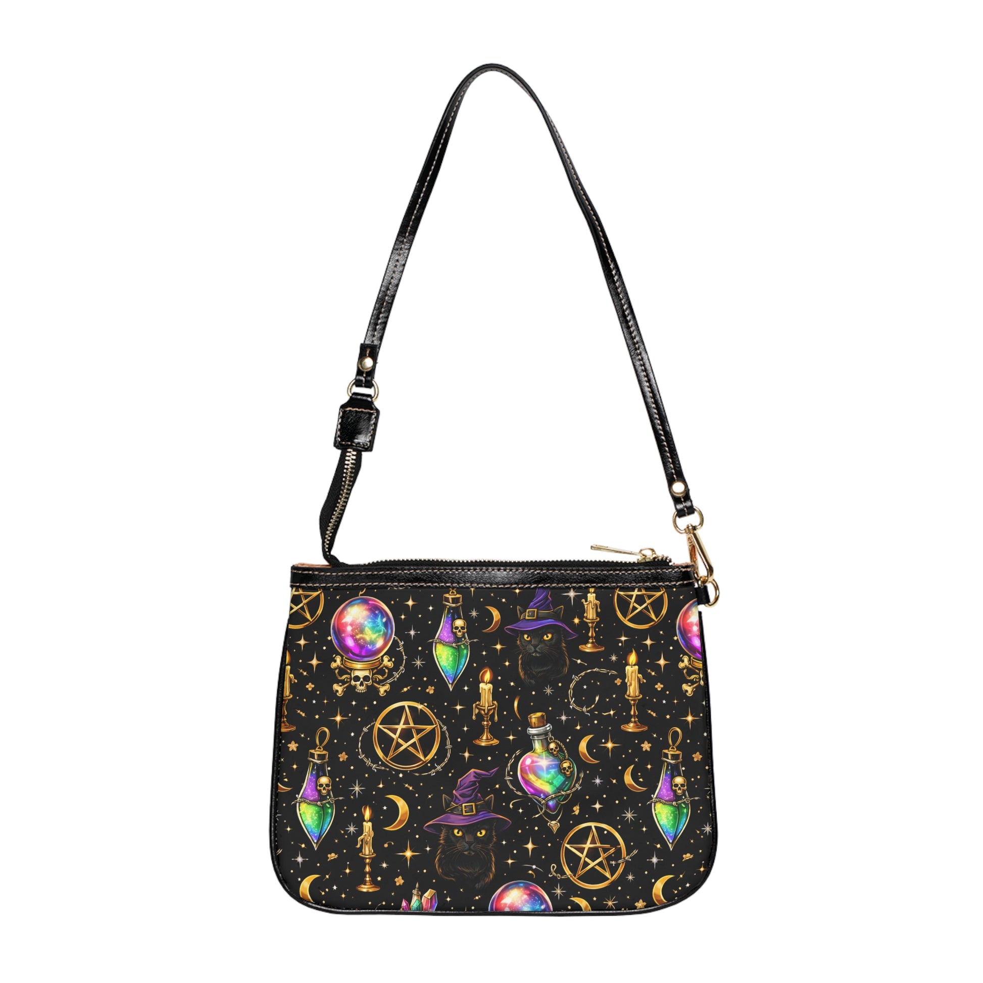 Carry a little mystery with you. This small shoulder bag channels a mystic sorceress vibe—deep, jewel-toned prints and golden hardware that catch the light like charms on a spellbook. It sits comfortably at the hip, hands-free, and opens to reveal two neat interior pockets lined in polyester so your essentials stay organized. The double-sided, vibrant print turns every glance into a moment of intrigue. The black handle and gold zipper add a refined contrast that reads both modern and arcane. Bring it to a night market, a moonlit concert, or when you want your everyday look to feel quietly enchanted.