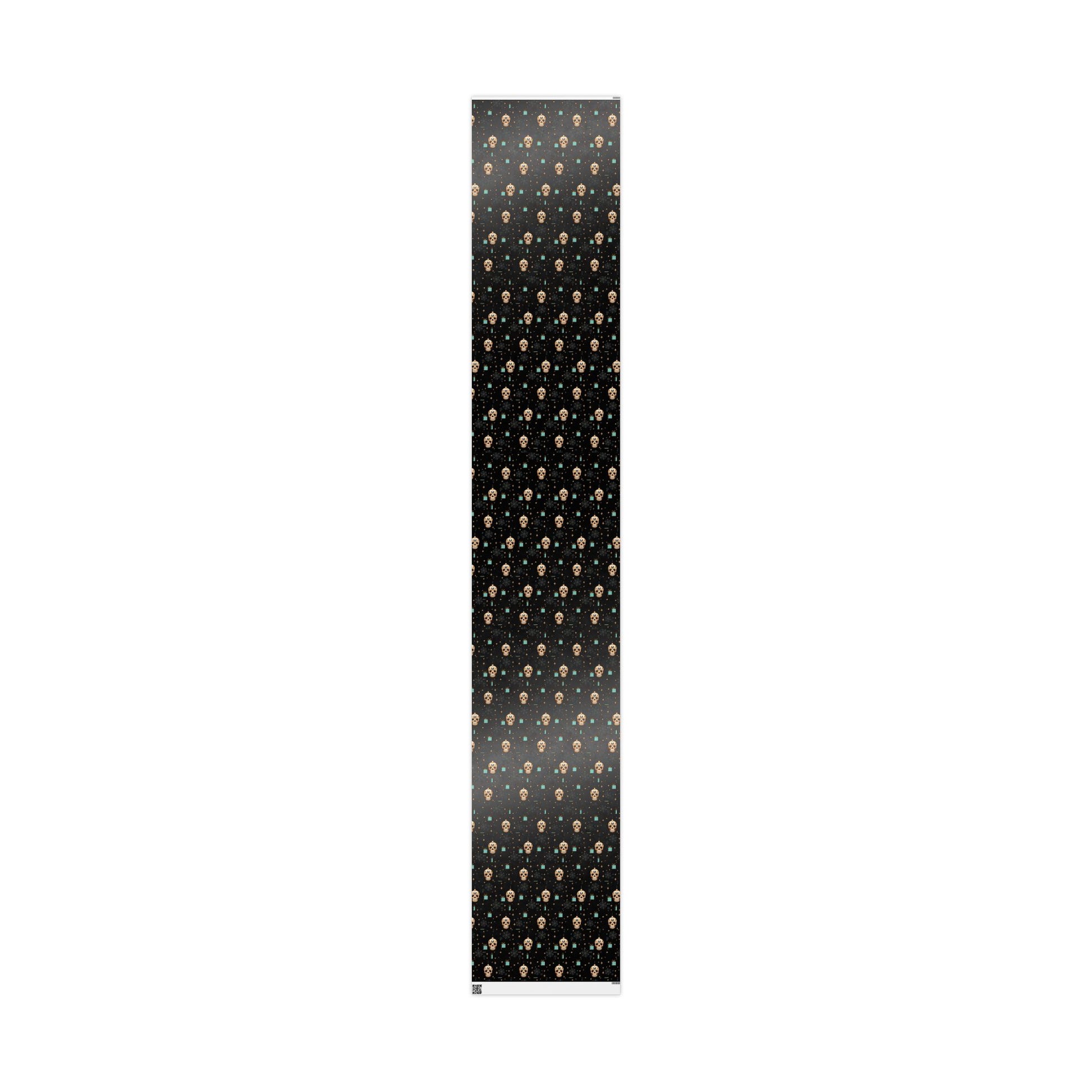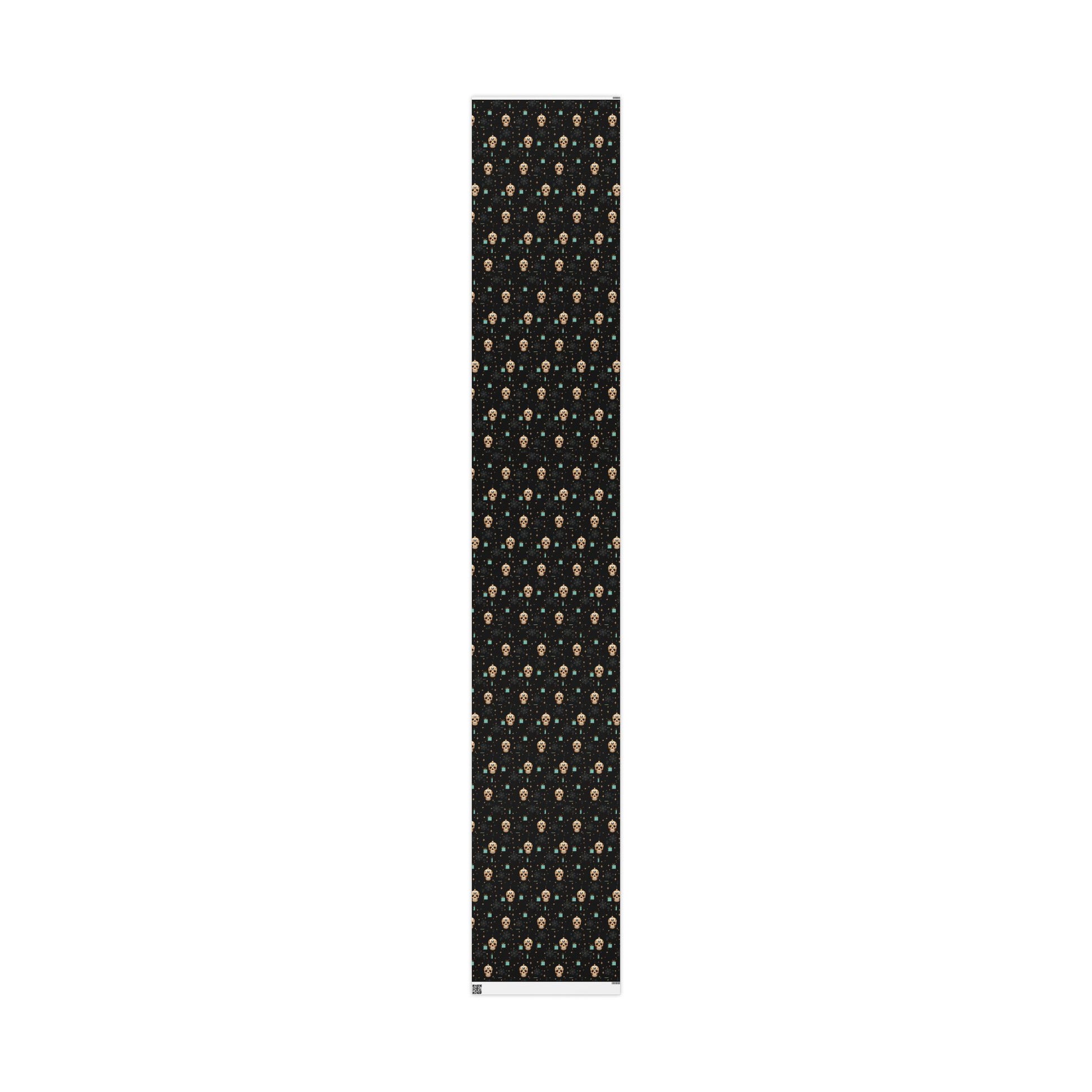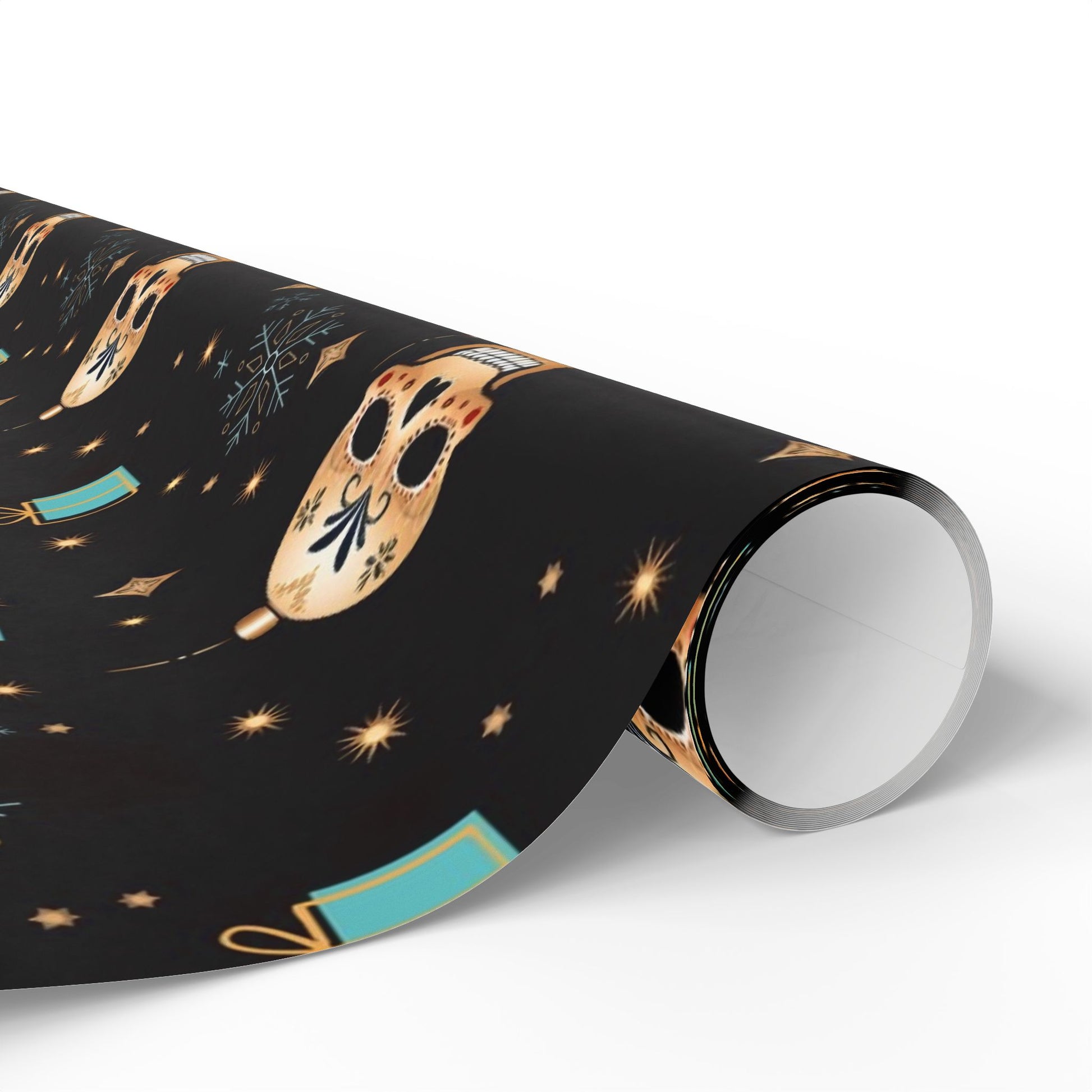 Midnight celebration meets folkloric charm. This 5x7 wrapping paper wraps gifts in a velvety black field scattered with golden sugar skulls, tiny teal presents, and delicate snowflake-like motifs. The design feels playful and slightly mysterious—great for someone who loves alternative holiday style or Day of the Dead-inspired decor. The subtle metallic tones and clean, repeating pattern make each parcel feel considered and a little luxurious, whether tucked under a tree or left on a mantel.