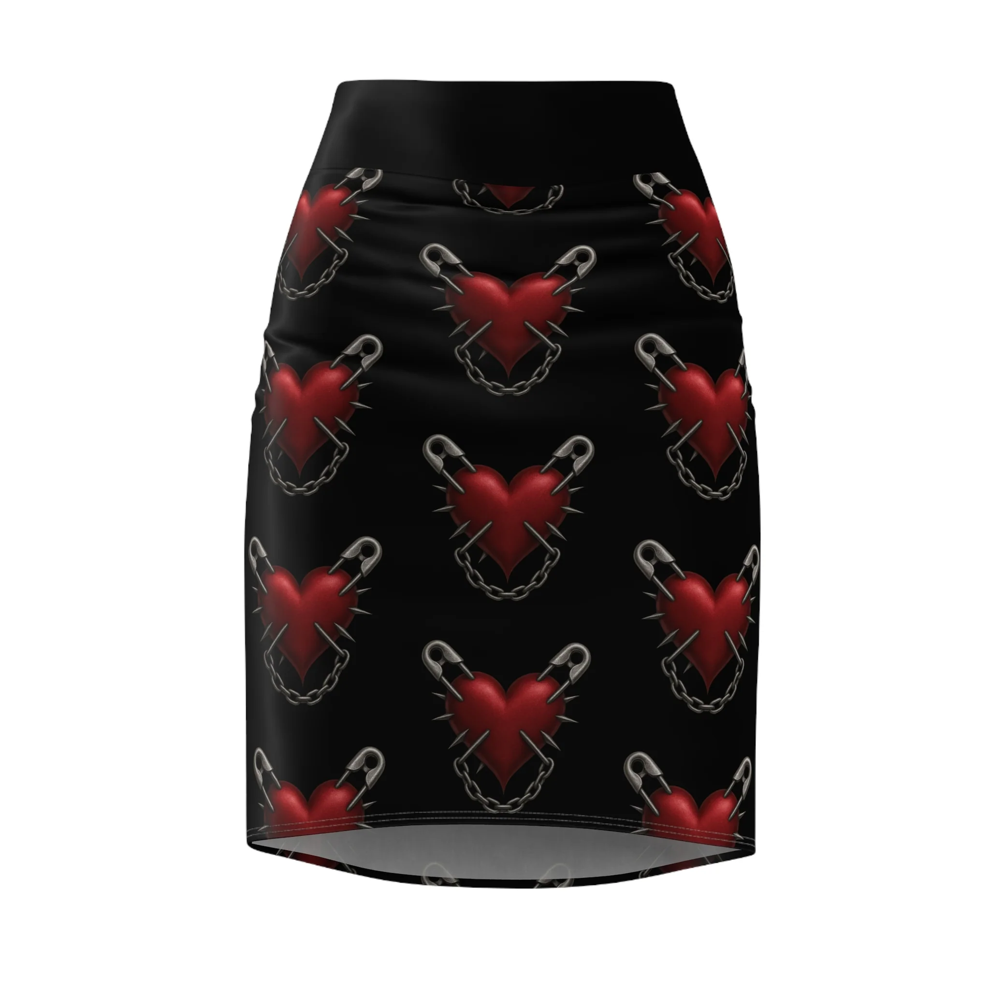 The Don’t Pin Me Down Pencil Skirt is rebellion stitched in curves. A bold heart-and-pin motif cuts through its sleek silhouette, turning a classic pencil skirt into a punk rock manifesto. High-waisted and body-hugging, it’s perfect for pairing with crop tops, fishnets, or leather jackets — a statement piece that dares anyone to try and tame you.
