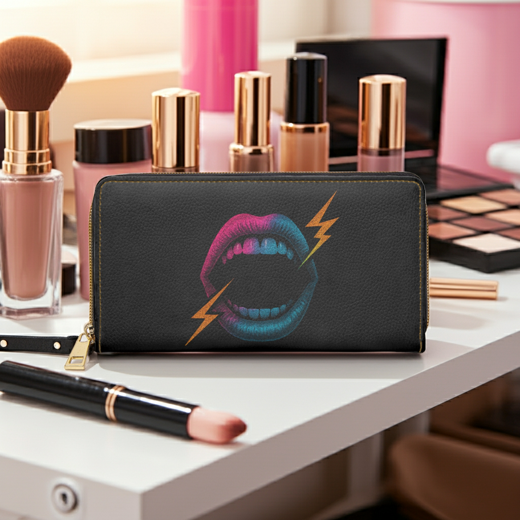 This vibrant and eye-catching zippered wallet features the design 'Loudmouth' by TheRockCollective. Made of durable PU leather, it has pockets for cash, credit cards, coins, and a checkbook. Perfect for those looking to add a pop of color to their everyday essentials, this wallet is relevant for those who love bold and unique designs.